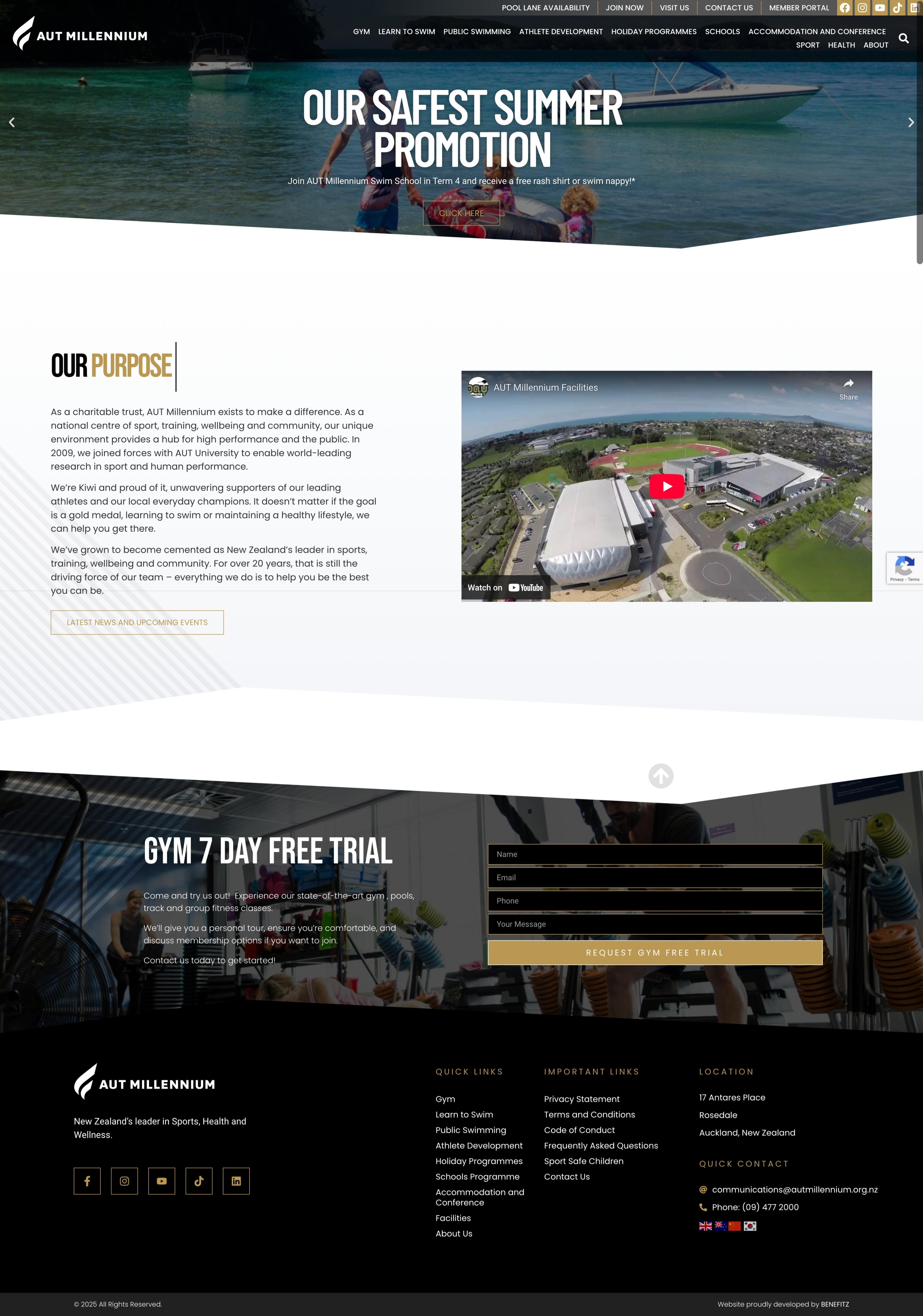 Benefitz partnered with AUT Millennium, New Zealand’s world-class sports, health, and fitness facility, to design and develop a dynamic website that reflects their mission of inspiring peak performance and wellbeing. The site showcases their wide range of services — from gym memberships and swim school programmes to physiotherapy, sports science, and community initiatives. Built with a strong emphasis on ease of management, the platform empowers the AUT Millennium team to update timetables, events, and resources quickly, ensuring members and visitors always have access to the latest information. With a clean, modern design and intuitive navigation, the website captures the energy of AUT Millennium while delivering a seamless digital experience for athletes, families, and the wider community.